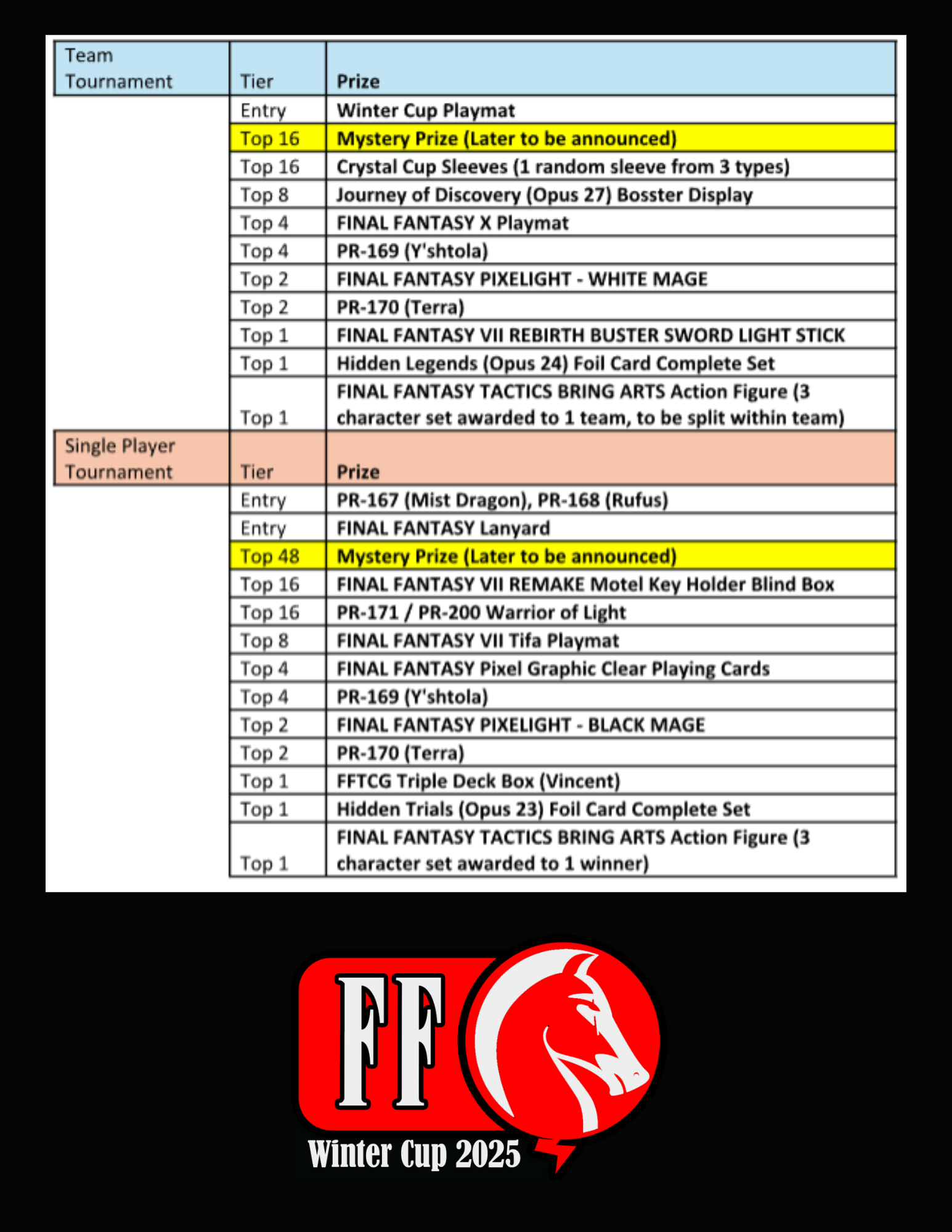Prizing stacks by placement — higher-ranking teams will receive all prizes from their tier and below. (Full prize details to be confirmed by Square Enix)