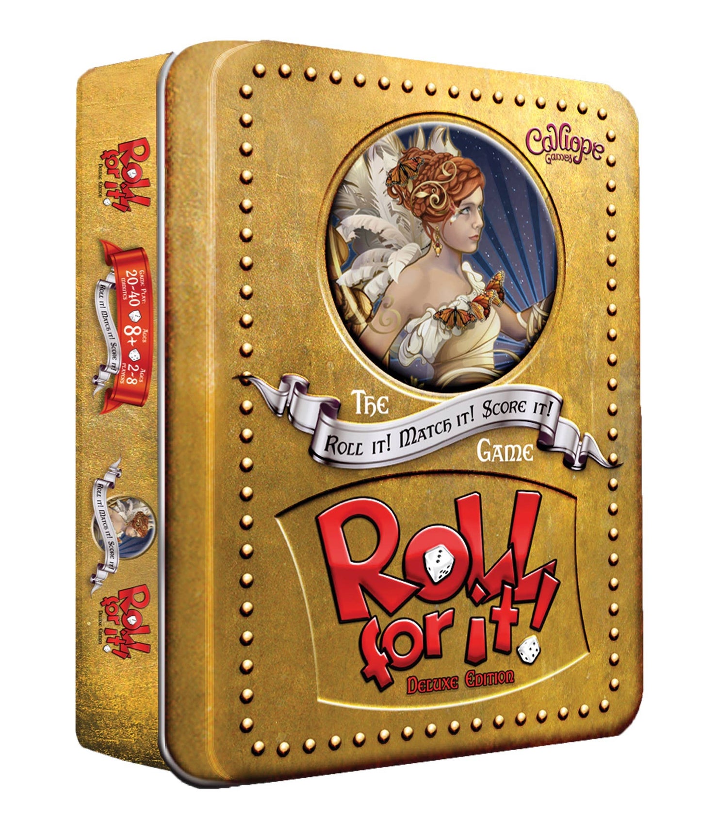 Roll For It! Deluxe combines the fast-paced action of Roll For It! with the beauty of Calliope's iconic artwork. The Deluxe Edition combines the contents of both the red and purple standard editions of Roll For It! Included are 48 stunning dice, a crushed velvet dice bag embroidered with the Roll For It! logo, and 60 exquisitely detailed cards featuring your favorite Calliope characters. The Deluxe Edition is presented in a beautifully embossed tin with a hinged lid—the rich flocked interior of which doubles as a dice tray—and fits perfectly into your back pocket, making the Roll For It! Deluxe Edition the perfect choice for gamers on the move.