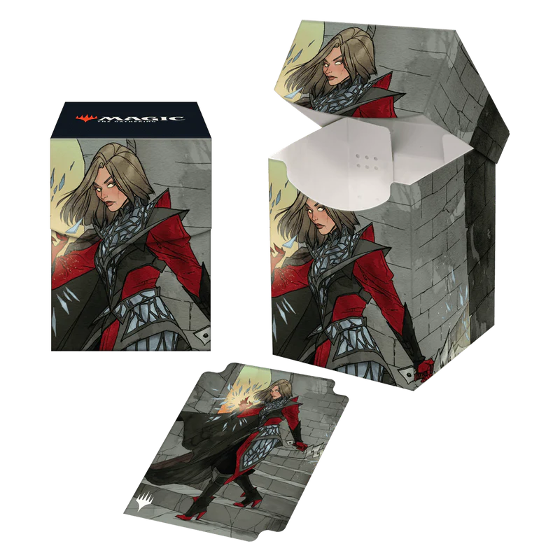 The 100+ Deck Box® card storage container features vibrant, full-color artwork from Magic: The Gathering and includes a deck divider. Made with archival-safe, non-PVC, rigid polypropylene materials, you can store up to 100 double-sleeved cards with confidence. The self-locking lid keeps your cards securely stored when not in use, while also offering easy access. Sized for standard-size trading cards.